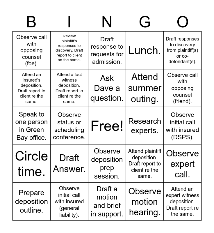This bingo card has a free space and 24 words: Draft Answer., Observe initial call with insured (general liability)., Ask Dave a question., Prepare deposition outline., Draft responses to discovery from plaintiff(s) or co-defendant(s)., Observe call with opposing counsel (foe)., Attend an insured’s deposition. Draft report to client re the same., Review plaintiff’s responses to discovery. Draft report to client on the same., Research experts., Observe deposition prep session., Attend summer outing., Speak to one person in Green Bay office., Attend plaintiff deposition. Draft report to client re the same., Observe expert call., Attend a fact witness deposition. Draft report to client re the same., Observe motion hearing., Observe initial call with insured (DSPS)., Draft response to requests for admission., Observe call with opposing counsel (friend)., Observe status or scheduling conference., Attend an expert witness deposition. Draft report re the same., Circle time., Lunch. and Draft a motion and brief in support..