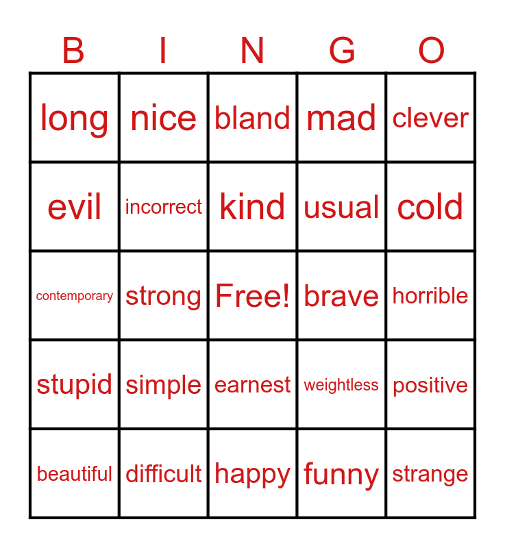 This bingo card has a free space and 24 words: simple, difficult, kind, beautiful, clever, long, evil, nice, brave, earnest, usual, contemporary, weightless, positive, incorrect, funny, horrible, bland, cold, strong, strange, stupid, mad and happy.