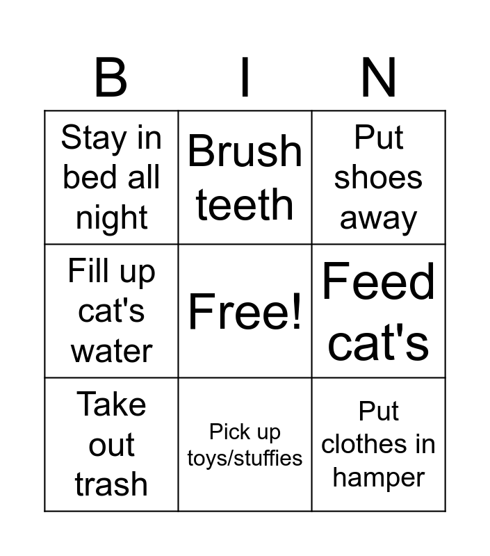 This bingo card has a free space and 8 words: Feed cat's, Put shoes away, Brush teeth, Take out trash, Stay in bed all night, Put clothes in hamper, Fill up cat's water and Pick up toys/stuffies.