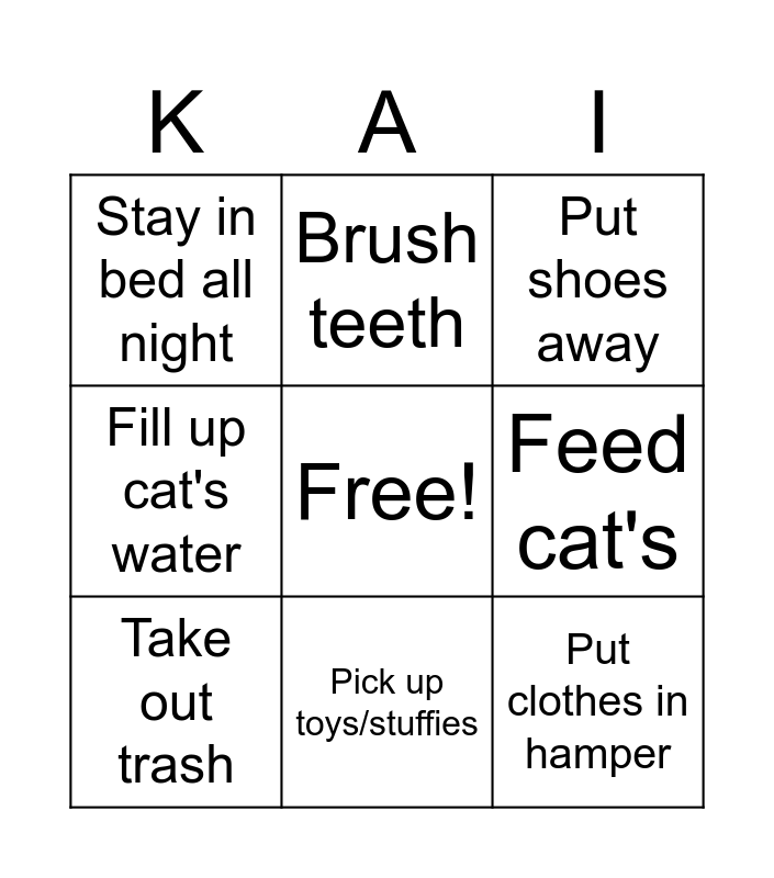This bingo card has a free space and 8 words: Feed cat's, Put shoes away, Brush teeth, Take out trash, Stay in bed all night, Put clothes in hamper, Fill up cat's water and Pick up toys/stuffies.
