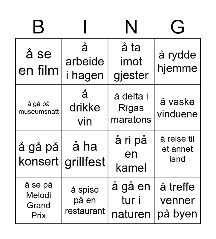 This bingo card has 20 words: å reise til et annet land, å gå på besøk, å ta imot gjester, å se på ishockey, å se på Melodi Grand Prix, å gå på museumsnatt, å spise på en restaurant, å se en film, å gå på konsert, å arbeide i hagen, å ha grillfest, å ri på en kamel, å drikke vin, å treffe venner på byen, å delta i Rīgas maratons, å leke med (egne eller andres) barn, å vaske vinduene, å rydde hjemme, å gå en tur i naturen and å sole seg.