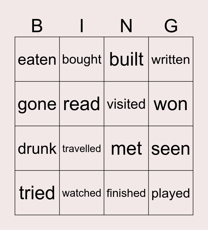 This bingo card has 16 words: watched, seen, built, eaten, drunk, bought, met, finished, gone, read, tried, written, travelled, won, visited and played.