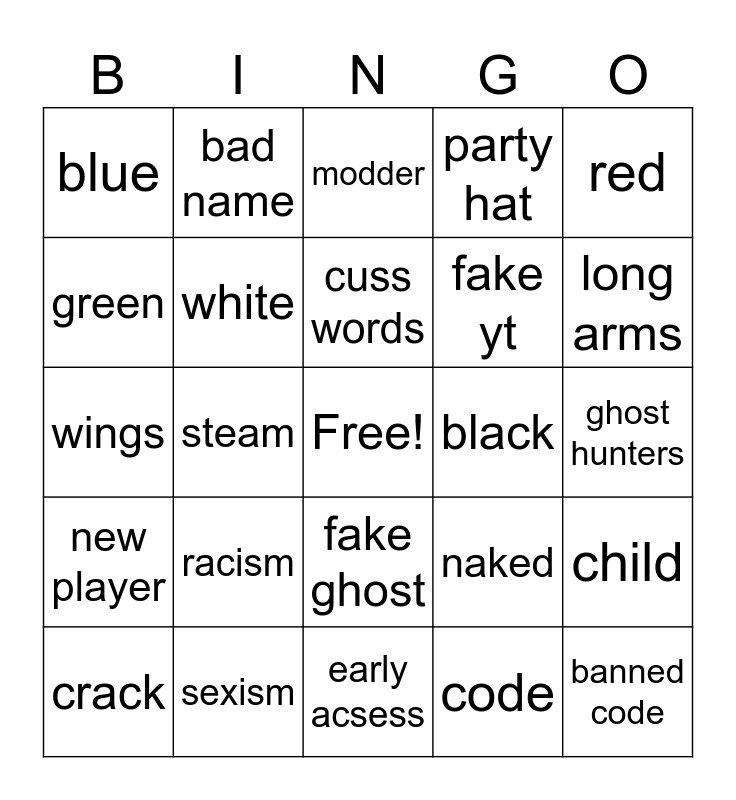 This bingo card has a free space and 24 words: racism, sexism, cuss words, crack, red, blue, green, bad name, black, fake ghost, fake yt, wings, naked, child, white, code, ghost hunters, modder, long arms, steam, banned code, new player, party hat and early acsess.