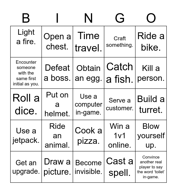 This bingo card has a free space and 24 words: Ride an animal., Draw a picture., Obtain an egg., Get an upgrade., Ride a bike., Light a fire., Encounter someone with the same first initial as you., Open a chest., Serve a customer., Cook a pizza., Catch a fish., Roll a dice., Win a 1v1 online., Blow yourself up., Defeat a boss., Cast a spell., Build a turret., Time travel., Kill a person., Put on a helmet., Convince another real player to say the word ‘toilet’ in-game., Use a jetpack., Craft something. and Become invisible..