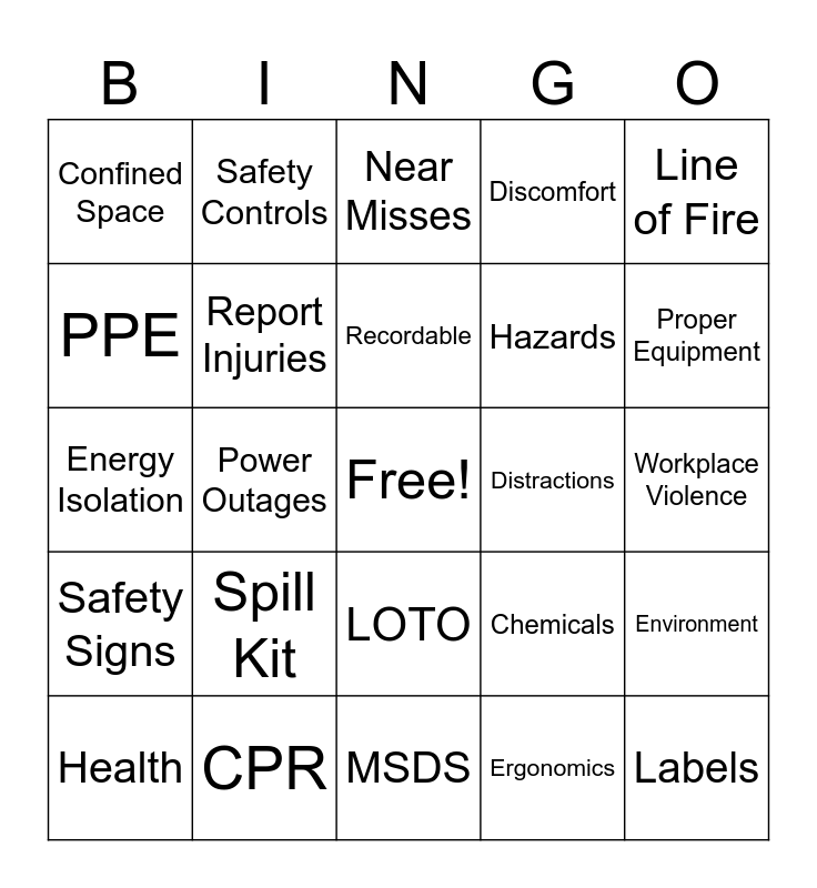 This bingo card has a free space and 29 words: Health, Environment, Power Outages, First Aid, Confined Space, Near Misses, Report Injuries, Spill Kit, Distractions, CPR, Workplace Violence, Labels, MSDS, Ergonomics, Proper Equipment, Unsafe Acts, LOTO, Safety Signs, Line of Fire, Energy Isolation, Chemicals, Proper Hygiene, Hazards, PPE, Discomfort, Safety Controls, Environment, Recordable and Injuries.