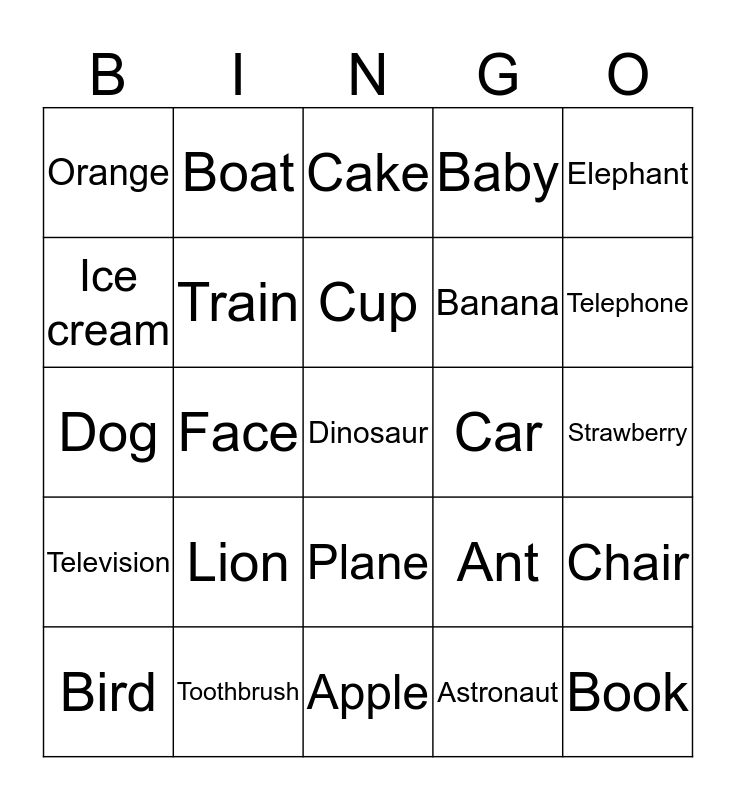 This bingo card has 25 words: Lion, Apple, Cup, Bird, Elephant, Orange, Ice cream, Boat, Car, Plane, Banana, Dog, Ant, Chair, Train, Book, Strawberry, Cake, Telephone, Face, Dinosaur, Toothbrush, Television, Baby and Astronaut.