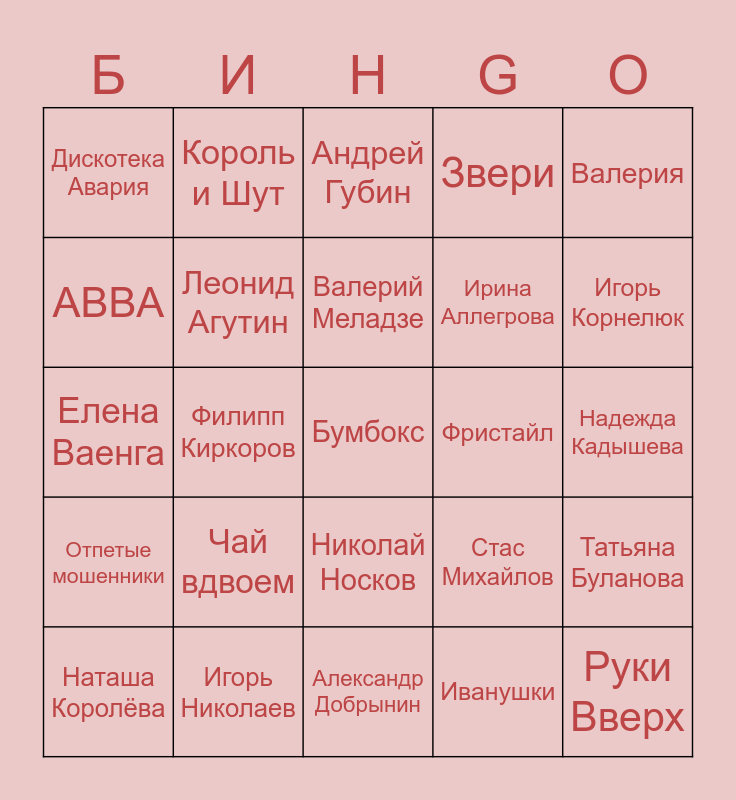 This bingo card has 25 words: Чай вдвоем, Александр Добрынин, Валерий Меладзе, Наташа Королёва, Валерия, Дискотека Авария, ABBA, Король и Шут, Фристайл, Николай Носков, Ирина Аллегрова, Елена Ваенга, Стас Михайлов, Татьяна Буланова, Леонид Агутин, Руки Вверх, Надежда Кадышева, Андрей Губин, Игорь Корнелюк, Филипп Киркоров, Бумбокс, Игорь Николаев, Отпетые мошенники, Звери and Иванушки.