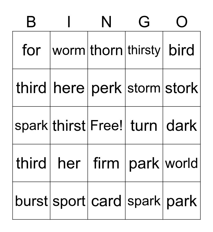 This bingo card has a free space and 29 words: burst, herd, thirst, form, for, thorn, here, her, turn, sport, dark, park, card, spark, stork, pork, firm, third, bird, spark, park, torn, storm, third, thirsty, worm, world, perk and first.