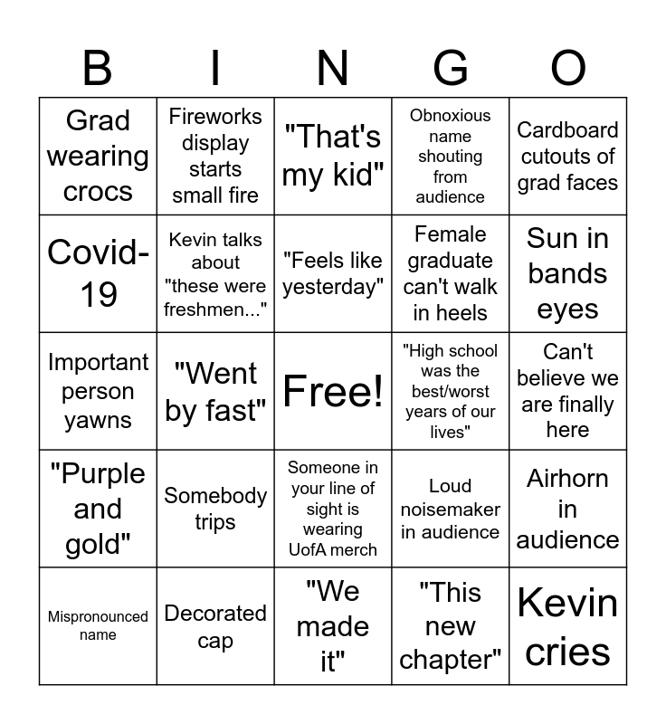 This bingo card has a free space and 47 words: "Saber cats ROAR", Kevin cries, Either of the Applegates cry, "We made it", Somebody trips, District person endorses TUSD, Fireworks display starts small fire, Balloon flies away, Covid-19, "As we embark on this journey", Kevin talks about "these were freshmen...", Obnoxious name shouting from audience, Airhorn in audience, Loud noisemaker in audience, Cline leaves early, "We laughed, we cried, but we grew", "Feels like yesterday", "High school was the best/worst years of our lives", Quotes Dr. Seuss, Cardboard cutouts of grad faces, "Went by fast", "This new chapter", Grad wearing crocs, Female graduate can't walk in heels, Sheet music blows away, Sun in bands eyes, Mispronounced name, Sports analogy, Someone in your line of sight is wearing UofA merch, "Purple and gold", Awkward silence, Instrument goes out of tune, Repeat processional 8+ times, Kevin rant about time at Sabino, "I remember (insert unrelatable personal story), Decorated cap, Can't believe we are finally here, Somebody misses 2nd ending, Parking lot completely full, Grad uses phone, Phone goes off during silence, "That's my kid", Important person yawns, "Friendships that will last a lifetime", Mistyped name, Grad wearing goofy costume and Jess does something questionable.
