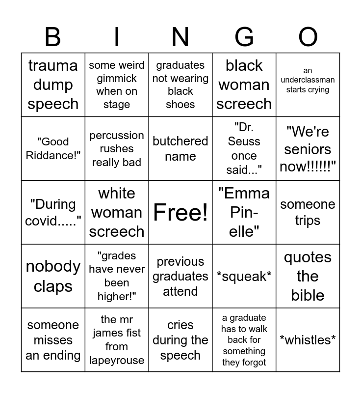 This bingo card has a free space and 39 words: something about vapes, valedictorian cries, choir fracks a note, percussion rushes really bad, someone misses an ending, previous graduates attend, butchered name, "we're gonna be in the school next year !1!!!111!", an underclassman starts crying, nobody claps, white woman screech, black woman screech, *whistles*, someone trips, "Emma Pin-elle", "grades have never been higher!", "we're just a family🥹🥹🥹", trauma dump speech, someone in band forgets *something*, *squeak*, "Good Riddance!", cries during the speech, "Dr. Seuss once said...", "We're seniors now!!!!!!", hot pink clothes, obnoxiously loud shoes, "At H.L.B.....", someone is extremely late, forgets to shake dr. g's hand, some weird gimmick when on stage, phone ringing during silence, skipping on/off stage, graduates not wearing black shoes, the mr james fist from lapeyrouse, a graduate has to walk back for something they forgot, "This year is one to remember.", quotes the bible, "During covid....." and Benton does something silly.
