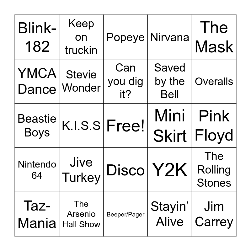 This bingo card has a free space and 24 words: Jive Turkey, The Arsenio Hall Show, Can you dig it?, Taz-Mania, The Mask, Blink-182, YMCA Dance, Keep on truckin, Mini Skirt, Disco, Saved by the Bell, Beastie Boys, Y2K, The Rolling Stones, Stevie Wonder, Stayin’ Alive, Pink Floyd, Popeye, Overalls, K.I.S.S, Jim Carrey, Nintendo 64, Nirvana and Beeper/Pager.