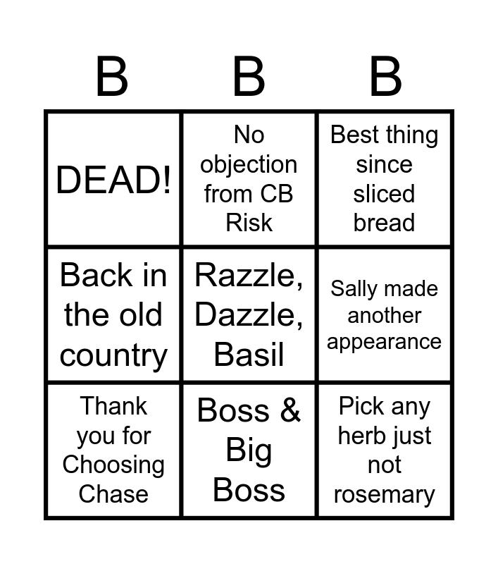 This bingo card has 13 words: Free!, Slap the Camel, Thank you for Choosing Chase, No objection from CB Risk, Back in the old country, Razzle, Dazzle, Basil, Pick any herb just not rosemary, English is my second language, Boss & Big Boss, DEAD!, Sally made another appearance, Best thing since sliced bread and Hard Pass.