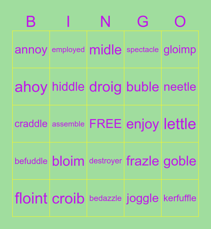This bingo card has a free space and 24 words: bloim, croib, droig, floint, gloimp, annoy, ahoy, employed, enjoy, destroyer, buble, craddle, frazle, goble, hiddle, joggle, lettle, midle, neetle, assemble, kerfuffle, befuddle, spectacle and bedazzle.