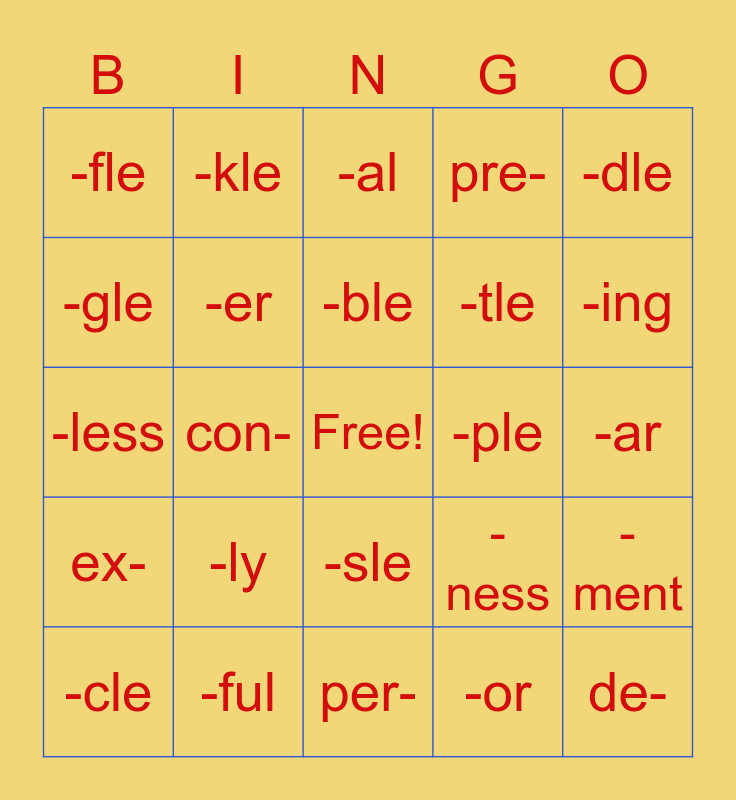 This bingo card has a free space and 24 words: -ly, -ful, -ble, -cle, -dle, -fle, -gle, -kle, -ple, -sle, -tle, -less, -ness, -ment, -er, -or, -ar, -al, -ing, con-, de-, ex-, pre- and per-.