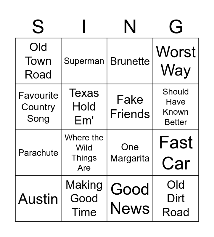 This bingo card has 28 words: A Bar Song, Tennessee Whiskey, Parachute, What I Want, Texas Hold Em', Brunette, Superman, Old Dirt Road, Making Good Time, Amen, One Margarita, Worst Way, I Am Not Okay, Lonely Road, Where the Wild Things Are, When it Rains It Pours, I'm the Problem, Fake Friends, Should Have Known Better, I Had Some Help, Old Town Road, Pink Skies, Austin, Fast Car, Good News, Park, Favourite Country Song and She Hates Me.