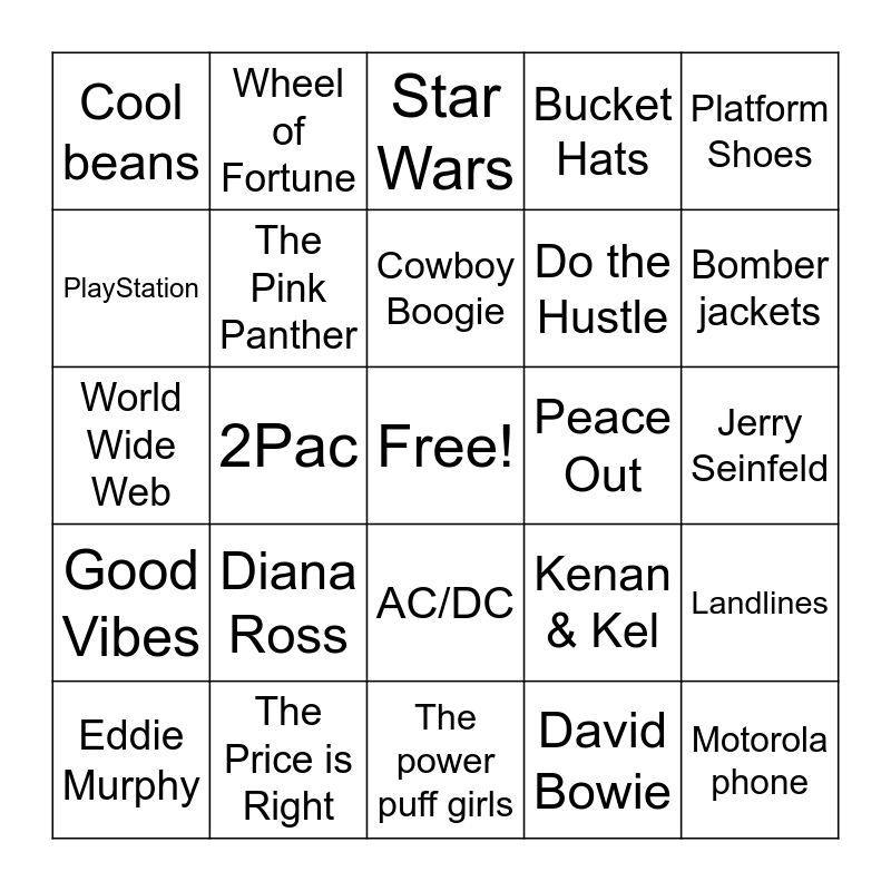 This bingo card has a free space and 24 words: Diana Ross, The Price is Right, Cowboy Boogie, Eddie Murphy, Platform Shoes, Cool beans, PlayStation, Wheel of Fortune, Peace Out, AC/DC, Do the Hustle, World Wide Web, Kenan & Kel, Landlines, The Pink Panther, David Bowie, Jerry Seinfeld, Star Wars, Bomber jackets, 2Pac, Motorola phone, Good Vibes, Bucket Hats and The power puff girls.