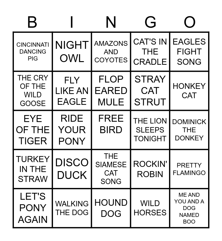 This bingo card has a free space and 79 words: A HORSE WITH NO NAME, ALLEY CAT, AMAZONS AND COYOTES, AND YOUR BIRD CAN SING, BABY ELEPHANT WALK, BABY, DO THE PHILLY DOG, BEAUTY AND THE BEAST, BIRD DOG, BIRDS AND THE BEES, BLACKBIRD, BLUE JAY WAY, BYE BYE BLACKBIRD, CAT'S IN THE CRADLE, CINCINNATI DANCING PIG, CROCODILE ROCK, THE CRY OF THE WILD GOOSE, CHICKEN DANCE, DISCO DUCK, DOGIE IN THE WINDOW, DOMINICK THE DONKEY, THE DONKEY SERENADE, EAGLES FIGHT SONG, EYE OF THE TIGER, FLOP EARED MULE, FLY LIKE AN EAGLE, FLY, ROBIN, FLY, GONE FISHIN', HEY BULLDOG, HIGH HORSE, HIS EYE ON THE SPAEEOW, HONKEY CAT, HOT CANARY, HOUND DOG, I'VE GOT A TIGET BY THE TAIL, LET'S PONY AGAIN, THE LION SLEEPS TONIGHT, LISTEN TO THE MOCKING BIRD, LITTLE RED ROOSTER, LONELY BULL, ME AND YOU AND A DOG NAMED BOO, MICKEY'S MONKEY, MIGHTY MOUSE, MOCKINGBIRD, MOCKINGBIRD HILL, MULE TRAIN, NIGHT OWL, OCTOPUS'S GARDEN, PEPINO, THE ITAIIAN MOUSE, PINK PANTHER THEME, PONY TIME, PRETTY FLAMINGO, RIDE YOUR PONY, ROCKIN' ROBIN, ROCKY RACOON, RUDOLPH, THE RED-NOSED REINDEER, RUNNING BEAR, SAVE A HORSE RIDE A COWBOY, SEE YOU LATER, ALLIGATOR, SHRIMP BOATS, THE SIAMESE CAT SONG, STRAY CAT STRUT, SURFIN' BIRD, TEDDY BIRD, THIS CAT'S ON A HOT TIN ROOF, THREE LITTLE BIRDS, TIE ME KANGAROO DOWN SPORT, TIGER, TIGER RAG, TOO MANY FISH IN THE SEA, TURKEY IN THE STRAW, WALKING THE DOG, WHEN DOVES CRY, WHITE RABBIT, WHO LET THE DOGS OUT, WHO'S AFRAID OF THE BIG BAD WOLF, WILD HORSES, WOODY WOODPECKER SONG, YEAR OF THE CAT and YELLOW BIRD.