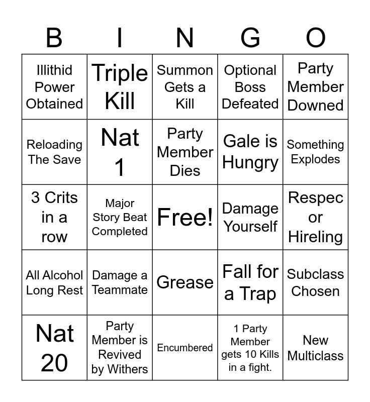 This bingo card has a free space and 39 words: Romance Progression, Level Up, Companion Met, Nat 1, Nat 20, Grease, Party Member Dies, TPK, Party Member Downed, All Alcohol Long Rest, Major Story Beat Completed, Optional Boss Defeated, New Multiclass, Respec or Hireling, Damage Yourself, Damage a Teammate, Stealing, Illithid Power Obtained, Guardian Shows Up, Fall for a Trap, Reloading The Save, Encumbered, Gale is Hungry, Something Explodes, Getting Off Task From a Quest, 5+ Minute Inventory Management Session, Accidental Fight Start, Friendly NPC Dies, Pentakill, Triple Kill, Healed from 1 HP to Full Health, One-Shot, Summon Gets a Kill, Party Member is Revived by Withers, 1 Party Member gets 10 Kills in a fight., 1 Party Member gets all kills in a fight that has more than 1 enemy., Subclass Chosen, 3 Crits in a row and 3 Magic Items Bought.