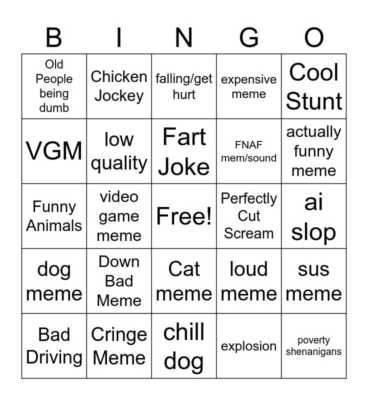 This bingo card has a free space and 24 words: Down Bad Meme, Cringe Meme, Fart Joke, Bad Driving, Cool Stunt, Old People being dumb, VGM, Chicken Jockey, Perfectly Cut Scream, Cat meme, FNAF mem/sound, Funny Animals, loud meme, sus meme, low quality, explosion, ai slop, falling/get hurt, actually funny meme, video game meme, poverty shenanigans, dog meme, expensive meme and chill dog.