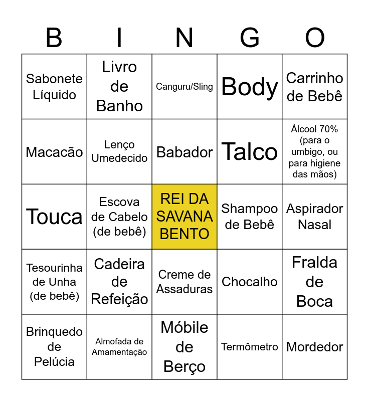 This bingo card has a free space and 35 words: Fralda, Mamadeira, Chupeta, Lenço Umedecido, Creme de Assaduras, Body, Macacão, Cobertor, Babador, Meia, Touca, Carrinho de Bebê, Bebê Conforto, Banheira, Sabonete Líquido, Shampoo de Bebê, Termômetro, Escova de Cabelo (de bebê), Tesourinha de Unha (de bebê), Mordedor, Chocalho, Brinquedo de Pelúcia, Fralda de Boca, Almofada de Amamentação, Canguru/Sling, Álcool 70% (para o umbigo, ou para higiene das mãos), Algodão, Cotonete (de bebê), Talco, Aspirador Nasal, Protetor de Berço, Móbile de Berço, Cadeira de Refeição, Livro de Banho and Colônia de Bebê.