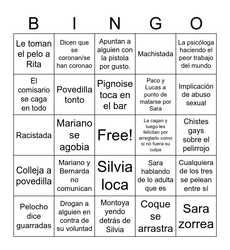 This bingo card has a free space and 24 words: Mariano y Bernarda no comunican, Drogan a alguien en contra de su voluntad, Pignoise toca en el bar, Pelocho dice guarradas, La psicóloga haciendo el peor trabajo del mundo, Le toman el pelo a Rita, El comisario se caga en todo, Dicen que se coronan/se han coronao, La cagan y luego les felicitan por arreglarlo como si no fuera su culpa, Silvia loca, Paco y Lucas a punto de matarse por Sara, Racistada, Sara hablando de lo adulta que es, Cualquiera de los tres se pelean entre sí, Povedilla tonto, Coque se arrastra, Chistes gays sobre el pelirrojo, Apuntan a alguien con la pistola por gusto., Implicación de abuso sexual, Mariano se agobia, Sara zorrea, Colleja a povedilla, Machistada and Montoya yendo detrás de Silvia.