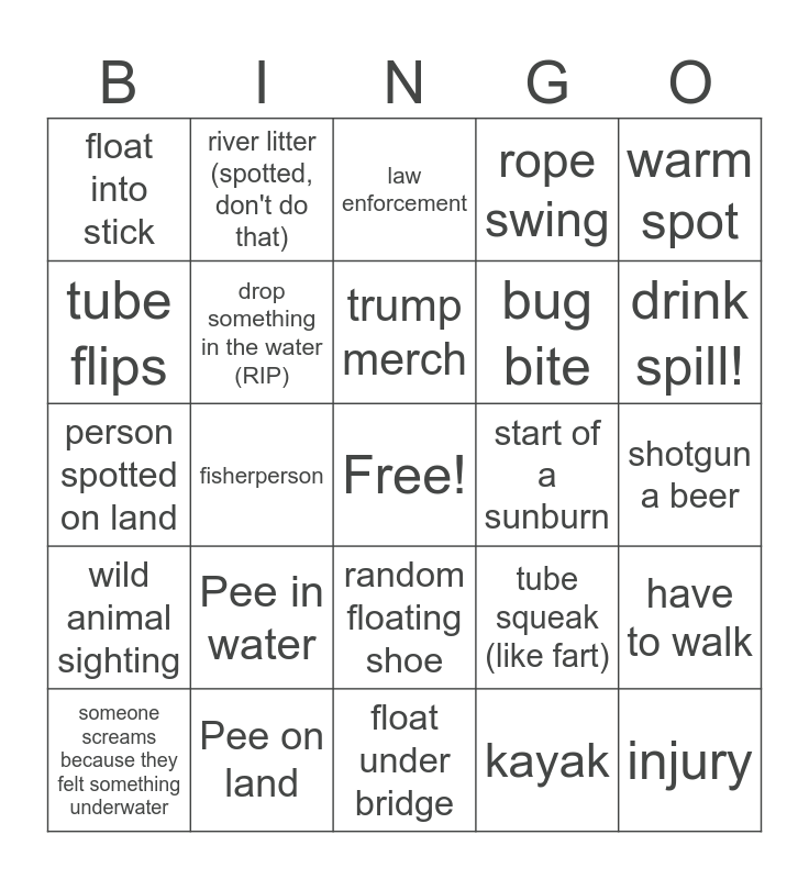 This bingo card has a free space and 24 words: Pee in water, Pee on land, trump merch, someone screams because they felt something underwater, warm spot, float into stick, tube flips, river litter (spotted, don't do that), start of a sunburn, random floating shoe, bug bite, person spotted on land, tube squeak (like fart), have to walk, drop something in the water (RIP), kayak, shotgun a beer, law enforcement, drink spill!, fisherperson, injury, wild animal sighting, rope swing and float under bridge.