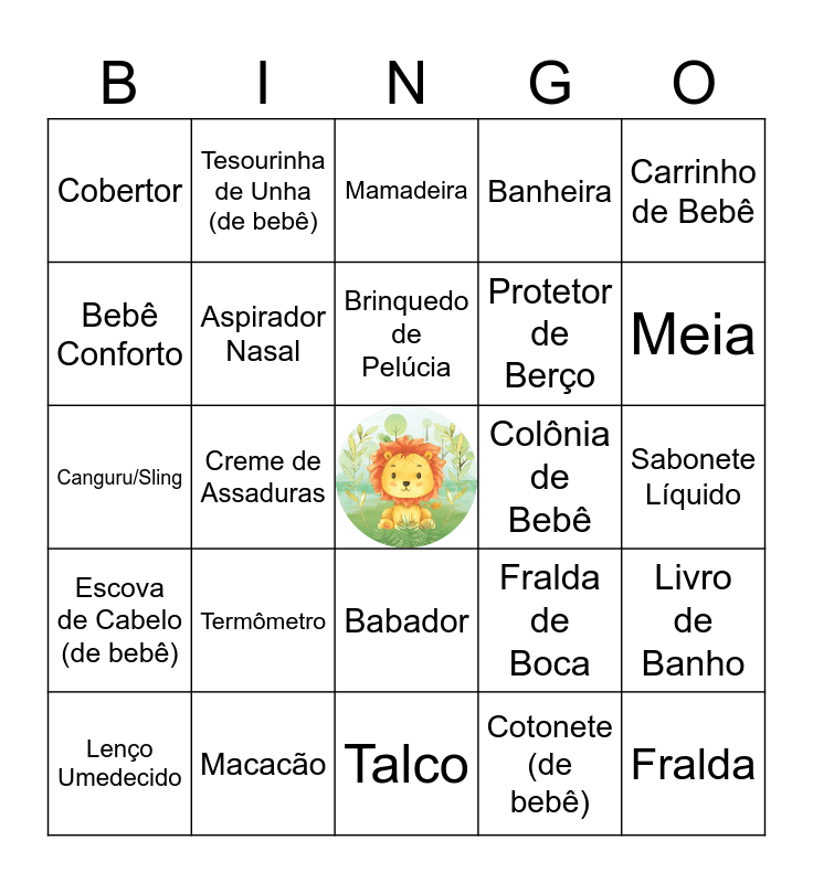 This bingo card has a free space and 35 words: Álcool 70% (para o umbigo, ou para higiene das mãos), Algodão, Almofada de Amamentação, Aspirador Nasal, Babador, Banheira, Bebê Conforto, Body, Brinquedo de Pelúcia, Cadeira de Refeição, Canguru/Sling, Carrinho de Bebê, Chocalho, Chupeta, Cobertor, Colônia de Bebê, Cotonete (de bebê), Creme de Assaduras, Escova de Cabelo (de bebê), Fralda, Fralda de Boca, Lenço Umedecido, Livro de Banho, Macacão, Mamadeira, Meia, Móbile de Berço, Mordedor, Protetor de Berço, Sabonete Líquido, Shampoo de Bebê, Talco, Termômetro, Tesourinha de Unha (de bebê) and Touca.