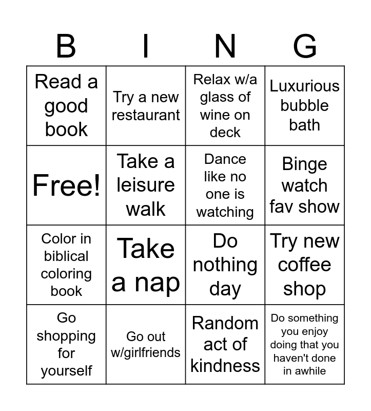 This bingo card has 16 words: Go out w/girlfriends, Try new coffee shop, Relax w/a glass of wine on deck, Read a good book, Color in biblical coloring book, Try a new restaurant, Do nothing day, Random act of kindness, Free!, Take a leisure walk, Go shopping for yourself, Luxurious bubble bath, Take a nap, Binge watch fav show, Dance like no one is watching and Do something you enjoy doing that you haven't done in awhile.