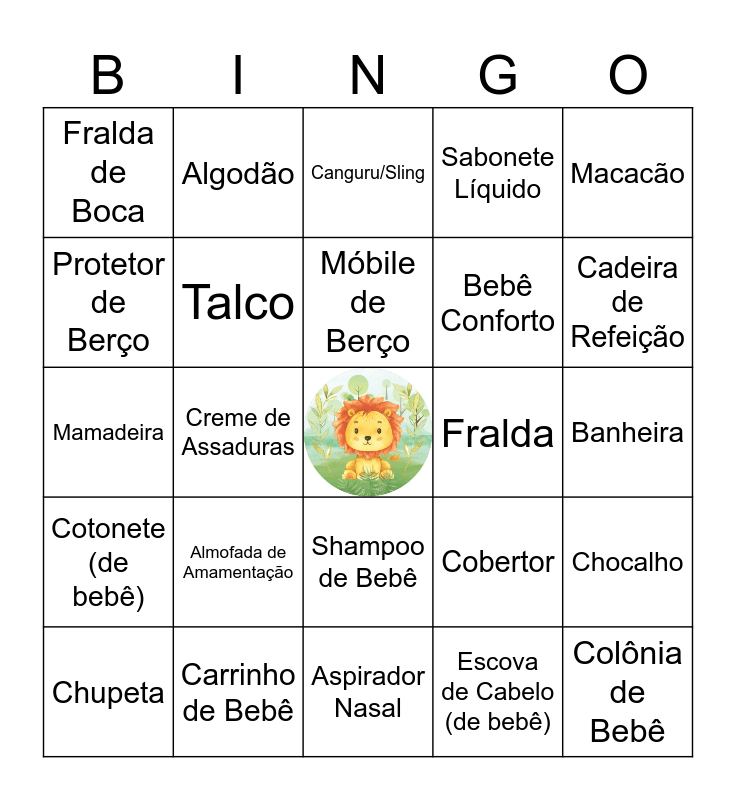 This bingo card has a free space and 35 words: Touca, Tesourinha de Unha (de bebê), Termômetro, Talco, Shampoo de Bebê, Sabonete Líquido, Protetor de Berço, Mordedor, Móbile de Berço, Meia, Mamadeira, Macacão, Livro de Banho, Lenço Umedecido, Fralda de Boca, Fralda, Escova de Cabelo (de bebê), Creme de Assaduras, Cotonete (de bebê), Colônia de Bebê, Cobertor, Chupeta, Chocalho, Carrinho de Bebê, Canguru/Sling, Cadeira de Refeição, Brinquedo de Pelúcia, Body, Bebê Conforto, Banheira, Babador, Aspirador Nasal, Almofada de Amamentação, Algodão and Álcool 70% (para o umbigo, ou para higiene das mãos).