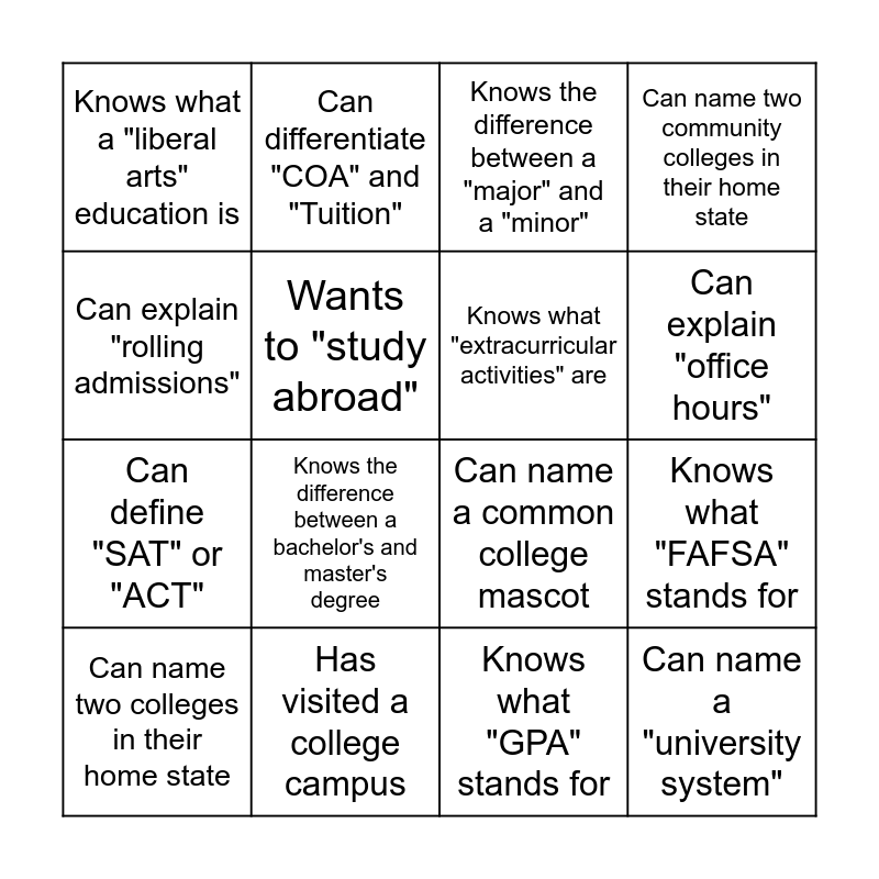 This bingo card has 16 words: Has visited a college campus, Knows what "FAFSA" stands for, Knows the difference between a "major" and a "minor", Knows what a "liberal arts" education is, Can define "SAT" or "ACT", Can differentiate "COA" and "Tuition", Can name a common college mascot, Knows what "GPA" stands for, Can explain "rolling admissions", Wants to "study abroad", Can name two colleges in their home state, Can name two community colleges in their home state, Knows the difference between a bachelor's and master's degree, Can explain "office hours", Knows what "extracurricular activities" are and Can name a "university system".