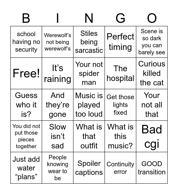 This bingo card has 60 words: Stiles, People knowing wear to be, Lying or doing things for no reason, You did not put those pieces together, Continuity error, People switching up to fast, It’s raining, Forthright antonym, The hospital, Mom breaking hospital laws, Perfect timing, Scott stare, Free!, Duuuuu * commercial*, School at night, school having no security, Music is played too loud, Scene is so dark you can barely see, Slowmo, Your not spider man, Get those lights fixed, Stiles being sarcastic, Just add water “plans”, Bad cgi, Bad green screen, Acting like no one can hear you, Why are you at bedroom door, Breaking laws, Curious killed the cat, Comedic transition, Cheesy lines, Creepy instead of scary, What are you on about?, Tedious, Werewolf’s not being werewolf’s, It’ll heal, Soundboard, And they’re gone, Unnecessary backflip, Guess who it is?, Mr. Platitude, Slow isn’t sad, Your not all that, Queer baiting, What is this music?, Product placement, Do you hear that?, Bad driver, Bad phone call skills, What is that outfit, Spoiler captions, “True alpha”, Bad acting, Fast and Furious, Confusing powers, Eyes up here, Good guess, Puffery, GOOD transition and Shirtless.