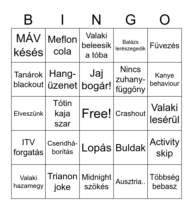 This bingo card has a free space and 24 words: Csendhá-borítás, Trianon joke, Jaj bogár!, Valaki hazamegy, Füvezés, MÁV késés, Tanárok blackout, Meflon cola, Crashout, Lopás, Nincs zuhany-függöny, Elveszünk, Buldak, Activity skip, Hang-üzenet, Ausztria.., Valaki lesérül, Valaki beleesik a tóba, Kanye behaviour, Tótin kaja szar, Többség bebasz, ITV forgatás, Balázs lerészegedik and Midnight szökés.