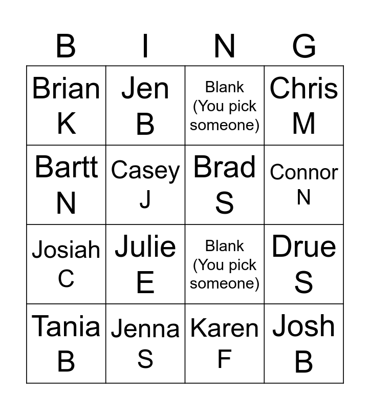 This bingo card has 23 words: Josh B, Lindsey R, Connor N, Dylan K, Bartt N, Brian K, Casey J, Jen B, Tania B, Doreen, Julie E, Josiah C, Pat H, Katie S, Jenna S, Matt J, Blank (You pick someone), Blank (You pick someone), Brad S, Drue S, Chris M, Karen F and Hanna F.