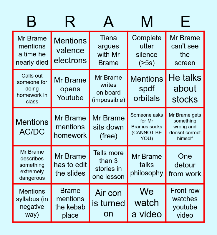 This bingo card has a free space and 55 words: Mild racism, Mild sexism, Krishna gets called out for food/drink, Complete utter silence (>5s), One detour from work, Random movie clip, Mr Brame opens Youtube, Literally just revision from the previous lesson, Mentions spdf orbitals, Mr Brame mentions food, Mr Brame mentions a time he nearly died, Someone calls Mr Brame old, Mr Brame calls us millennials, Mr Brame stands up, Mr Brame complains about young people, Prac lesson (impossible), Tiana argues with Mr Brame, Someone asks for Mr Brames socks (CANNOT BE YOU), Mr Brame talks about family, Mr Brame describes something extremely dangerous, Brame mentions the kebab place, Air con is turned on, We watch a video, Mr Brame can't see the screen, Mr Brame skips more than 3 slides at a time, Mr Brame mentions homework, Mr Brame writes on board (impossible), Front row person stands up to do something, He talks about stocks, Mr Brame mentions gender, "Back in my day", Tells more than 3 stories in one lesson, Mr Brame shows us his files, Says he'll buy food for someone, Calls out someone for doing homework in class, Mr Brame has to edit the slides, Mr Brame mentions something historical and non relevant to Chem, Mr Brame talks philosophy, Front row watches youtube video, Mentions periodic table, Mentions valence electrons, "Does anyone know", Another teacher comes in through the front door, Another teacher comes in through the back door, Mentions syllabus (in negative way), Mentions a pop culture franchise (e.g. Star Wars), Mentions Lego, Mr Brame prints something out for us, Asks us if we've seen movie, Mentions AC/DC, Mr Brames slides has a cool animation, Someone confuses inter and intra moleuclar forces, Mr Brame gets something wrong then corrects himself, Mr Brame gets something wrong and doesnt correct himself and Mr Brame picks on the people at the back.