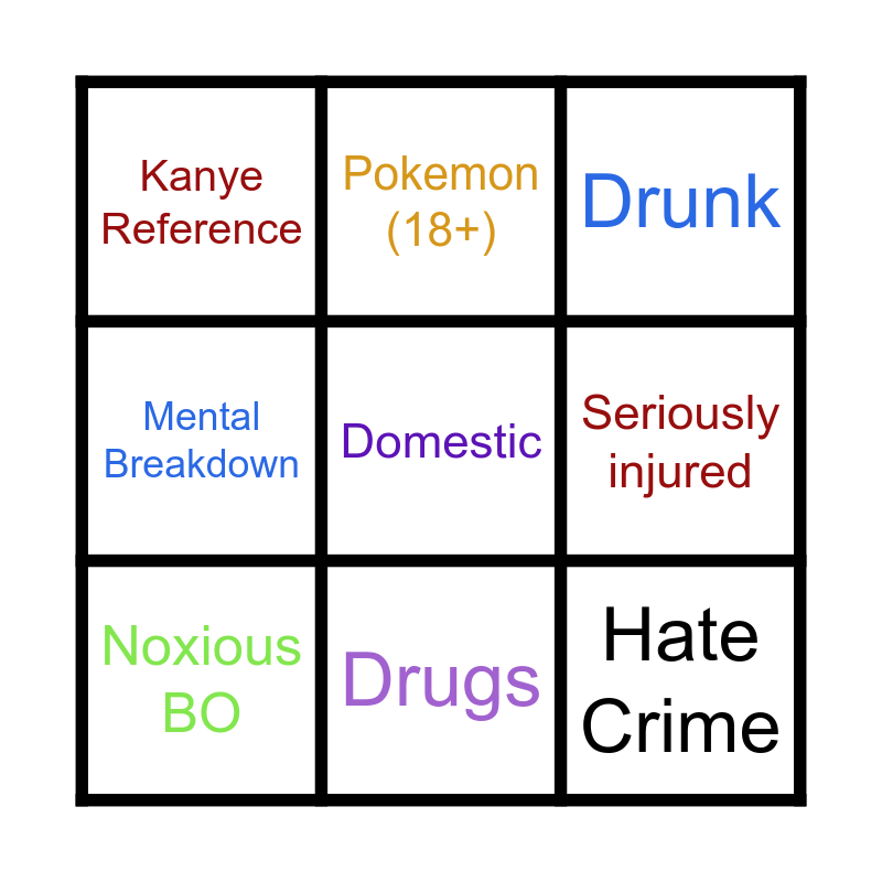 This bingo card has a free space and 8 words: Seriously injured, Drunk, Pokemon (18+), Noxious BO, Kanye Reference, Hate Crime, Mental Breakdown and Drugs.