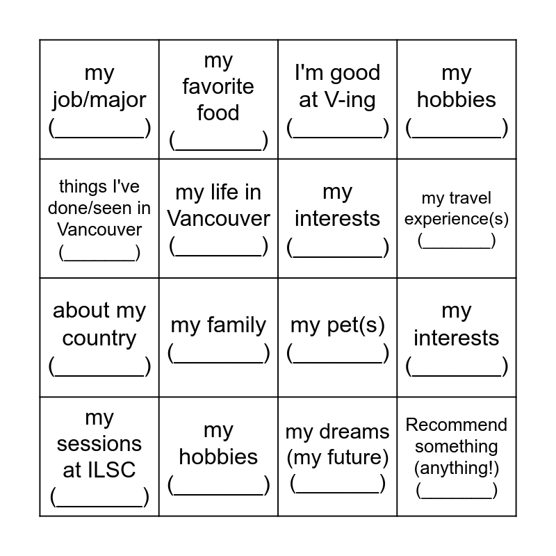 This bingo card has 16 words: my hobbies (_______), my interests (_______), I'm good at V-ing (_______), my job/major (_______), about my country (_______), my favorite food (_______), my pet(s) (_______), my dreams (my future) (_______), things I've done/seen in Vancouver (_______), my life in Vancouver (_______), my sessions at ILSC (_______), my hobbies (_______), my family (_______), my travel experience(s) (_______), my interests (_______) and Recommend something (anything!) (_______).