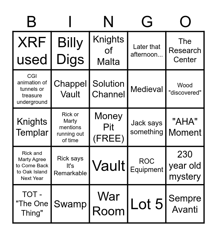 This bingo card has a free space and 24 words: Rick says It's Remarkable, Swamp, Solution Channel, TOT - "The One Thing", The Research Center, XRF used, CGI animation of tunnels or treasure underground, Billy Digs, Jack says something, Vault, Medieval, Knights Templar, ROC Equipment, 230 year old mystery, Chappel Vault, Lot 5, "AHA" Moment, Knights of Malta, Wood "discovered", Rick or Marty mentions running out of time, Sempre Avanti, Rick and Marty Agree to Come Back to Oak Island Next Year, Later that afternoon... and War Room.
