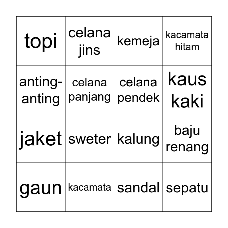 This bingo card has 20 words: baju renang, gelang, kemeja, pakaian, gaun, anting-anting, kacamata, topi, jaket, celana jins, sweter, kalung, celana panjang, sepatu, celana pendek, rok, kaus kaki, kacamata hitam, sandal and baju / kaus.