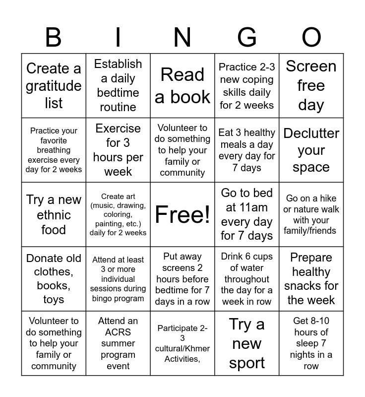 This bingo card has a free space and 24 words: Attend at least 3 or more individual sessions during bingo program, Attend an ACRS summer program event, Volunteer to do something to help your family or community, Volunteer to do something to help your family or community, Screen free day, Create a gratitude list, Practice your favorite breathing exercise every day for 2 weeks, Establish a daily bedtime routine, Go to bed at 11am every day for 7 days, Put away screens 2 hours before bedtime for 7 days in a row, Eat 3 healthy meals a day every day for 7 days, Try a new ethnic food, Drink 6 cups of water throughout the day for a week in row, Prepare healthy snacks for the week, Exercise for 3 hours per week, Try a new sport, Go on a hike or nature walk with your family/friends, Read a book, Declutter your space, Create art (music, drawing, coloring, painting, etc.) daily for 2 weeks, Get 8-10 hours of sleep 7 nights in a row, Donate old clothes, books, toys, Practice 2-3 new coping skills daily for 2 weeks and Participate 2-3 cultural/Khmer Activities,.