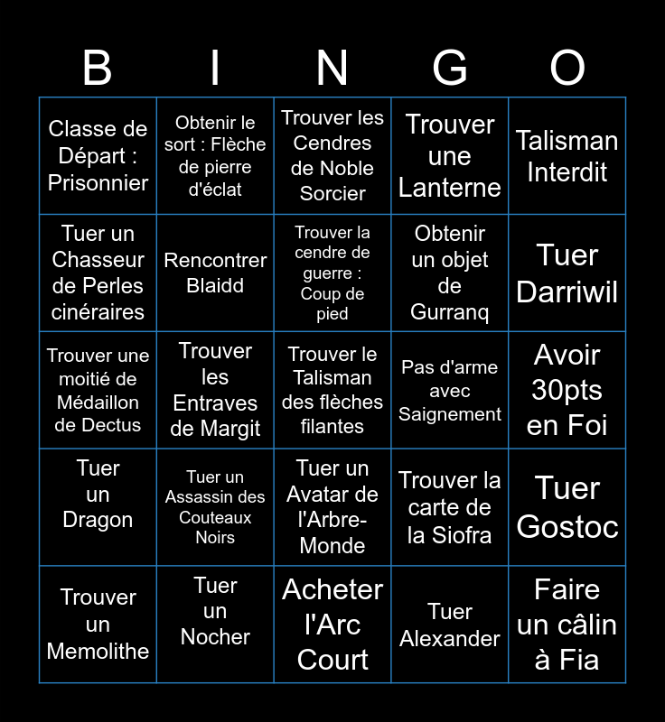 This bingo card has 25 words: Tuer un Assassin des Couteaux Noirs, Acheter l'Arc Court, Trouver la cendre de guerre : Coup de pied, Trouver un Memolithe, Talisman Interdit, Classe de Départ : Prisonnier, Tuer un Chasseur de Perles cinéraires, Obtenir le sort : Flèche de pierre d'éclat, Pas d'arme avec Saignement, Tuer un Avatar de l'Arbre-Monde, Obtenir un objet de Gurranq, Trouver une moitié de Médaillon de Dectus, Trouver la carte de la Siofra, Tuer Gostoc, Rencontrer Blaidd, Faire un câlin à Fia, Avoir 30pts en Foi, Trouver les Cendres de Noble Sorcier, Tuer Darriwil, Trouver les Entraves de Margit, Trouver le Talisman des flèches filantes, Tuer un Nocher, Tuer un Dragon, Trouver une Lanterne and Tuer Alexander.