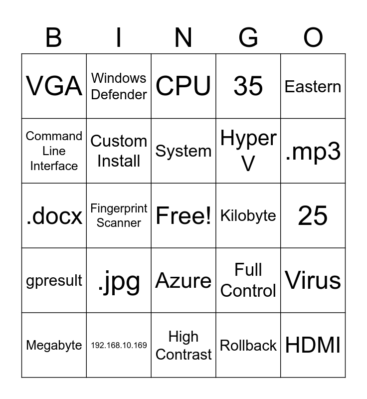 This bingo card has a free space and 80 words: 86.192.10.5, GUI, CPU, Night light, Driver, Video Card, Hard Drive, .mp4, Resolution, Microsoft Account, 30, .xlsx, 35, VGA, .pptx, Command Line Interface, Time and Language, .jpg, Power Supply, 25, Administrator, Eastern, .docx, System, Custom Install, Orientation, Memory, Update Install, Local Account, Optical Drive, .mp3, Color Filters, High Contrast, Settings & About, Megabyte, Kilobyte, Terabyte, Standard User, OneDrive, HDMI, DisplayPort, Program Files, Program Files (x86), C:\Windows, Users Folder, Windows Defender, Differential, Firewall, Smart Card, UAC, Virus, Fingerprint Scanner, Full Control, Trojan Horse, Password, 2FA, Write, Teams, Worm, Azure, Hyper V, Incremental, Modify, MDM, Extranet, MAM, McDonald's WiFi, Enroll, Safe Mode, Safe Mode with Networking, gpresult, 192.168.10.169, ipconfig, gpupdate, 169.254.2.251, Boot Logging, Rollback, Intranet, Home Network and Device Manager.