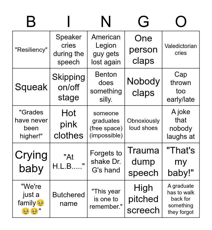 This bingo card has a free space and 36 words: "We're gonna be in the school next year !1!!!111!", Whistles, Quotes the Bible, Skipping on/off stage, Trauma dump speech, Crying baby, Benton does something silly., "During COVID.....", Valedictorian cries, Phone ringing during silence, Hot pink clothes, One person claps, Some weird gimmick when on stage, Obnoxiously loud shoes, Cap thrown too early/late, "Resiliency", An underclassman starts crying, "At H.L.B.....", A graduate has to walk back for something they forgot, American Legion guy gets lost again, A joke that nobody laughs at, "That's my baby!", Butchered name, "We're just a family🥹🥹🥹", "This year is one to remember.", Speaker cries during the speech, "Grades have never been higher!", Balloon(s), Nobody claps, Squeak, "Dr. Seuss once said...", Something about vapes, High pitched screech, Forgets to shake Dr. G's hand, Long, awkward pause and Someone is extremely late.