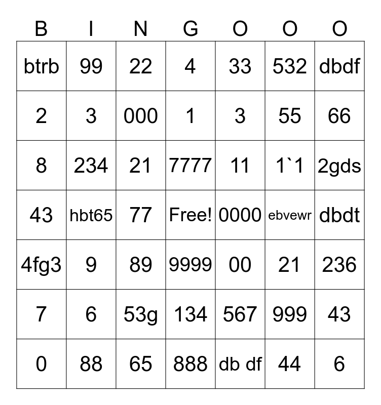 This bingo card has a free space and 55 words: db df, 2gds, 24gt, btrb, hbt65, 6, dbdf, 2efg, 3, 53g, 4, 236, dbdt, ebvewr, 0, 4fg3, 33, 3, 44, 55, 66, 9, 11, 22, 678, 2, 77, u64, 8, 1`1, 345, 21, 43, 88, 532, 1, 7, 234, 6, 89, 99, 134, 567, 111, 21, 43, 65, 00, 0000, 000, 9999, 999, 888, 7777 and 66665.