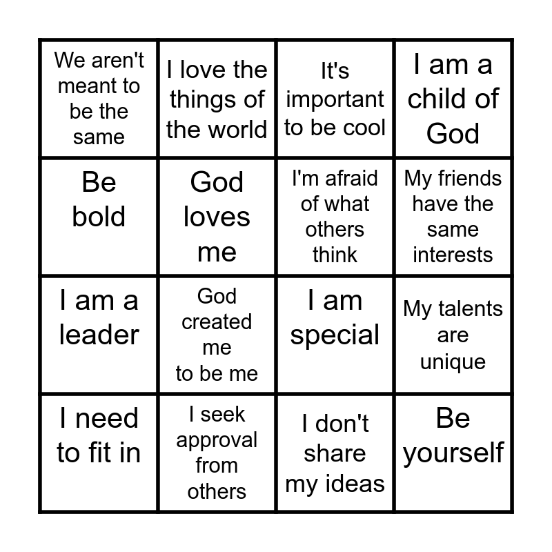 This bingo card has 16 words: I seek approval from others, My talents are unique, It's important to be cool, We aren't meant to be the same, I am a leader, I love the things of the world, I am special, I don't share my ideas, Be bold, God loves me, I need to fit in, I am a child of God, God created me to be me, My friends have the same interests, I'm afraid of what others think and Be yourself.
