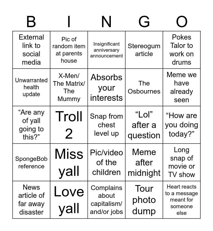 This bingo card has a free space and 24 words: Miss yall, Love yall, Absorbs your interests, News article of far away disaster, Pokes Talor to work on drums, External link to social media, Unwarranted health update, Pic of random item at parents house, “Lol” after a question, Pic/video of the children, The Osbournes, “Are any of yall going to this?”, Meme after midnight, Long snap of movie or TV show, X-Men/ The Matrix/ The Mummy, Tour photo dump, “How are you doing today?”, Insignificant anniversary announcement, Meme we have already seen, Troll 2, Heart reacts to a message meant for someone else, SpongeBob reference, Stereogum article and Complains about capitalism/ and/or jobs.