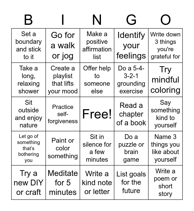 This bingo card has a free space and 70 words: Write in a journal, Say something kind to yourself, Let yourself cry, Practice deep breathing, Meditate for 5 minutes, Take a social media break, Identify your feelings, Talk to a trusted person, Write down 3 things you're grateful for, Do a guided meditation, Name 3 things you like about yourself, Visualize your happy place, Set a boundary and stick to it, Make a positive affirmation list, Check in with your emotions, Practice self-forgiveness, Sit in silence for a few minutes, Do a 5-4-3-2-1 grounding exercise, Make a list of things you can control, Let go of something that’s bothering you, Read a chapter of a book, Do a puzzle or brain game, Try mindful coloring, Take a break from screens, Practice being present, Watch a documentary, Do something slowly and mindfully, Reflect on your week, List goals for the future, Say no to something you don’t want to do, Go for a walk or jog, Stretch your body, Drink a full glass of water, Take a nap, Get a full night’s sleep, Eat a nourishing snack, Dance to your favorite music, Try a new physical activity, Do a short home workout, Take a long, relaxing shower, Doodle or sketch freely, Paint or color something, Write a poem or short story, Decorate your space, Make a vision board, Create a playlist that lifts your mood, Try a new DIY or craft, Take aesthetic photos of nature, Bake or cook something new, Make something just for fun (no pressure), Call or text a friend, Spend time with family, Smile at someone, Give a genuine compliment, Write a kind note or letter, Share how you're feeling with someone, Offer help to someone else, Play a game with others, Do a random act of kindness, Hang out with someone who makes you feel safe, Sit outside and enjoy nature, Light a candle or incense, Clean or organize one small area, Create a cozy space for yourself, Go barefoot in grass or sand, Stargaze or watch the sunset, Listen to calming nature sounds, Plant something or tend to a garden, Do nothing—rest without guilt and Reflect on your values or beliefs.