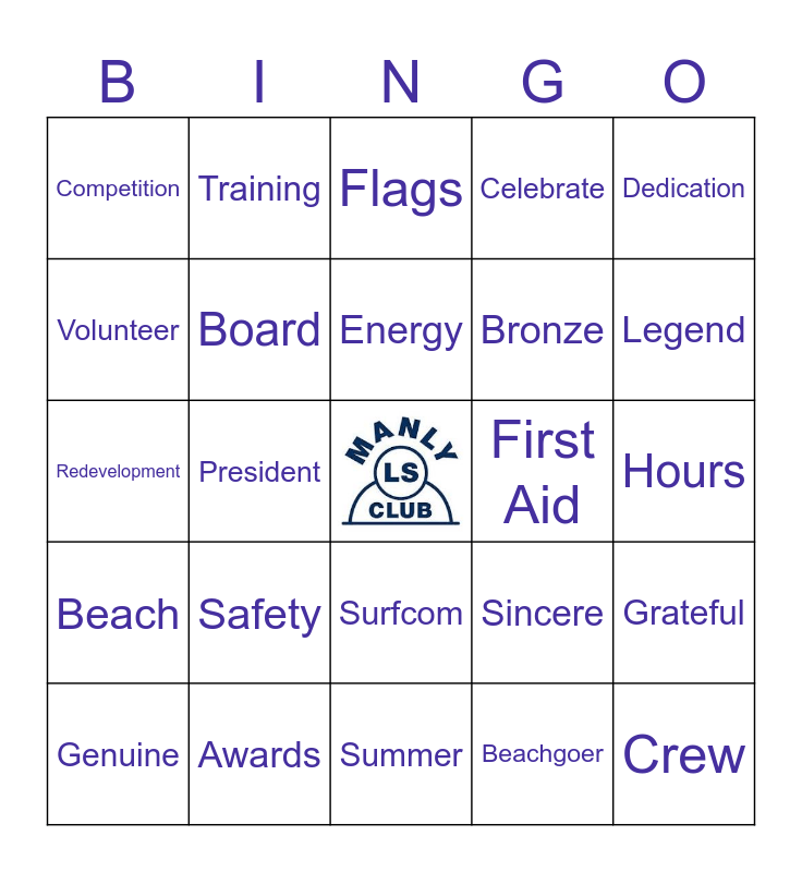 This bingo card has a free space and 58 words: Manly, Awards, Aussies, Beach, Beachgoer, Bluebottle, Board, Break, Bronze, Captain, Celebrate, Club, Contribution, Commitment, Community, Competition, Crew, Dedication, Education, Energy, First Aid, Flags, Genuine, Grateful, Heartfelt, Hours, IRB, Leadership, Legend, Lifesaving, Member, Night, Nippers, Northern Beaches, Paddle, Passion, Patrol, President, Redevelopment, Rescue, Safety, Season, Sincere, Ski, Spirit, SRC, Surf, Surfcom, Summer, Support, Swimmer, Teamwork, Thank, Time, Training, Uniform, Volunteer and Win.