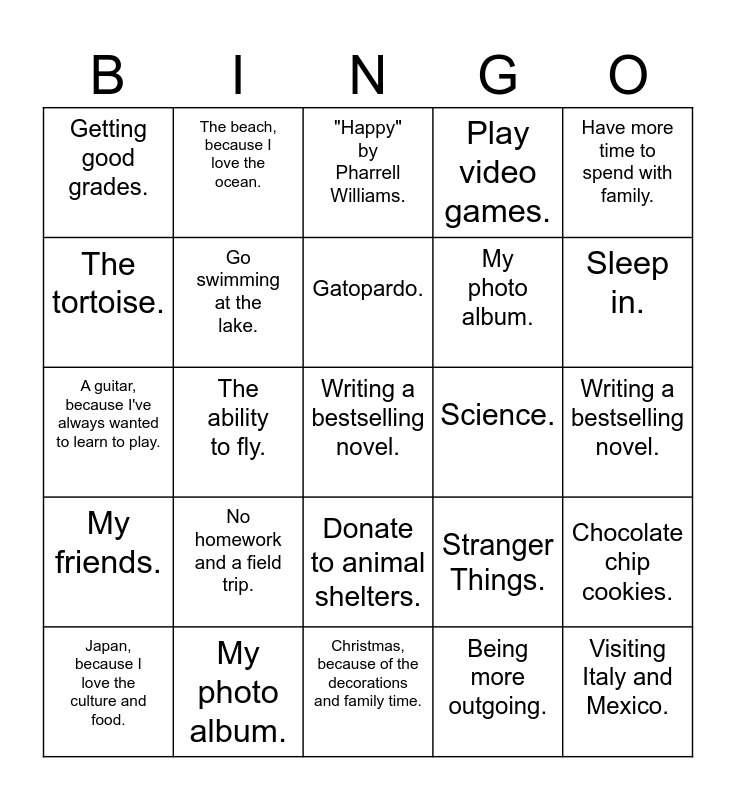 This bingo card has 25 words: My friends., My photo album., Writing a bestselling novel., Being more outgoing., Have more time to spend with family., Getting good grades., The beach, because I love the ocean., "Happy" by Pharrell Williams., Science., Chocolate chip cookies., The tortoise., Go swimming at the lake., Christmas, because of the decorations and family time., Stranger Things., Sleep in., Japan, because I love the culture and food., The ability to fly., Gatopardo., My photo album., Writing a bestselling novel., A guitar, because I've always wanted to learn to play., No homework and a field trip., Donate to animal shelters., Play video games. and Visiting Italy and Mexico..