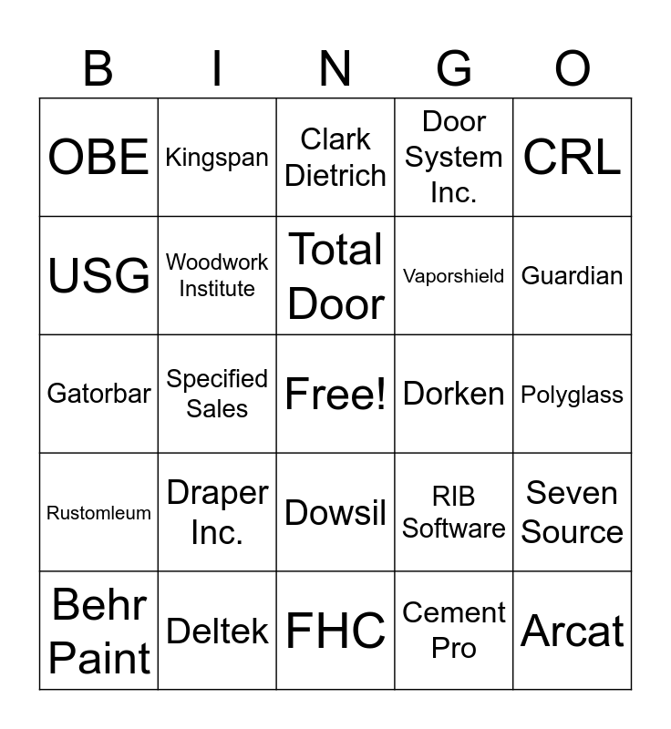 This bingo card has a free space and 45 words: Acousthectics, Arcat, AWI - Architectural Woodwork Institute, Behr Paint, Berridge, Cement Pro, Clark Dietrich, Conspectus Inc, CRL, Deltek, Door System Inc., Dorken, Dowsil, Draper Inc., Dupont, FHC, Garland, Gatorbar, GCP, Guardian, Kingspan, Metal Sales, Noble Company, OBE, Polycoat Products, Polyglass, Rainguard, Raynor, RIB Software, Rustomleum, Schulter, Seven Source, Sherwin Williams, Siplast, Soprema, Specified Sales, Stonhard, Structa Wire, Taylor Metal, Total Door, USG, Vaporshield, Vista Paint, Woodwork Institute and Wrenco.