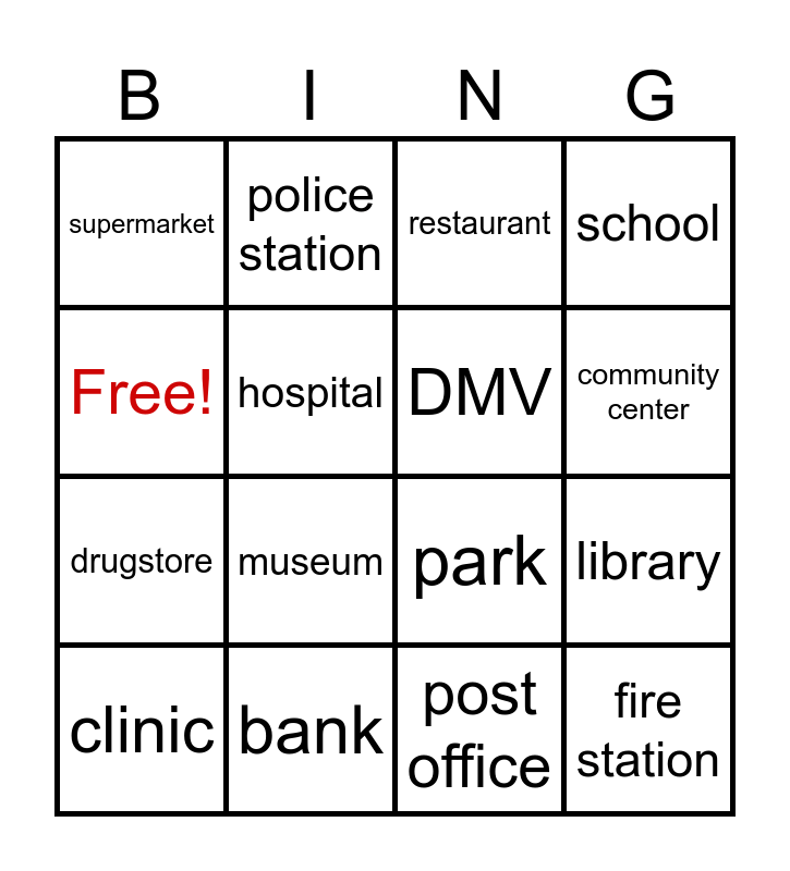 This bingo card has 16 words: bank, library, restaurant, supermarket, drugstore, police station, park, post office, Free!, hospital, clinic, school, museum, community center, DMV and fire station.